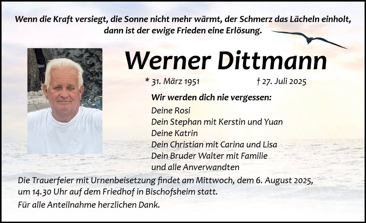 In liebevoller Erinnerung: Deine Herzlichkeit, Deine direkte Art und Deine Hilfsbereitschaft werden uns immer begleiten. Wir sind dankbar für die gemeinsamen Momente die er uns geschenkt hat. Ruhe in Frieden. Du wirst immer in unseren Herzen sein, Onkel Werner.